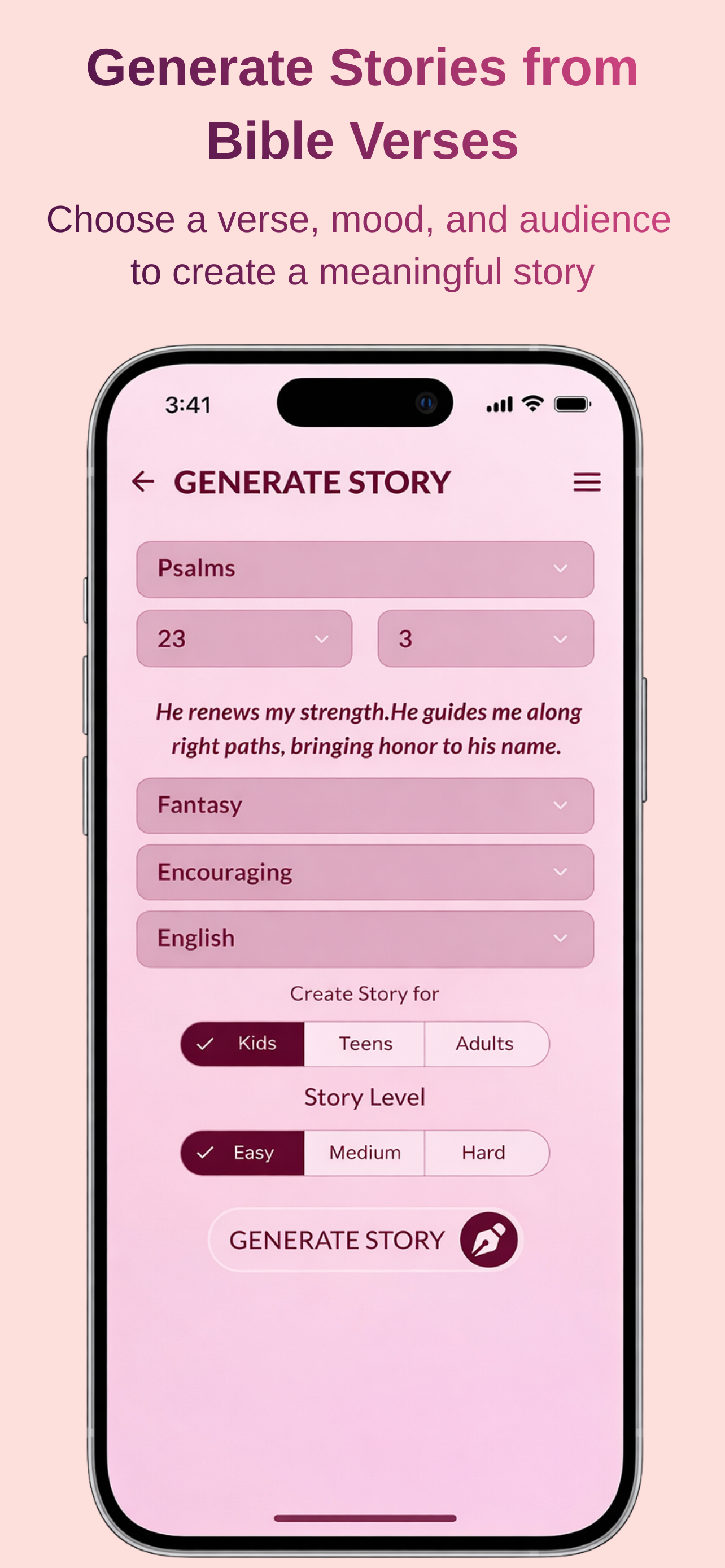 Tap the generate button and watch as AI transforms your chosen verse into a meaningful story with historical context and practical application.