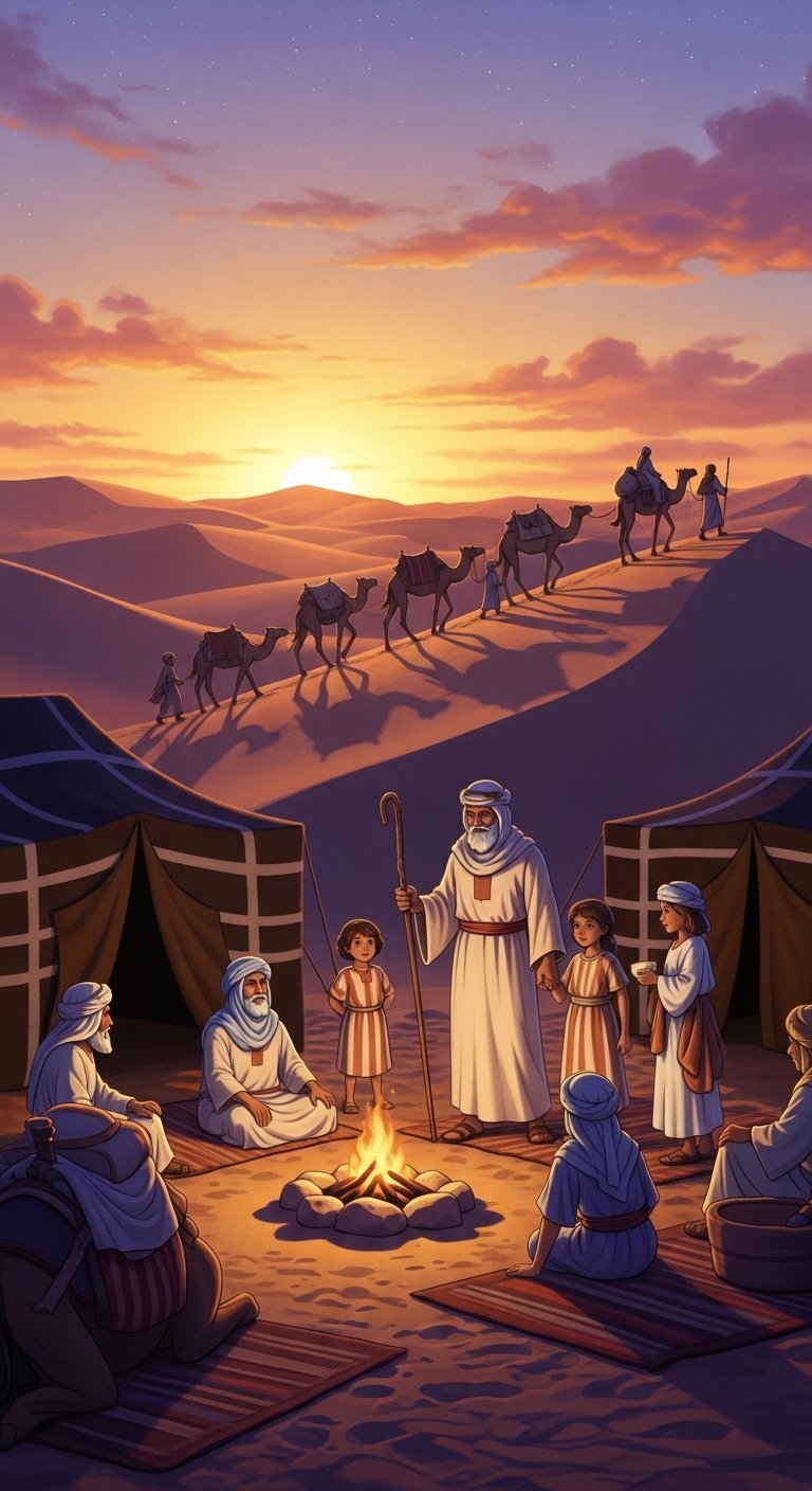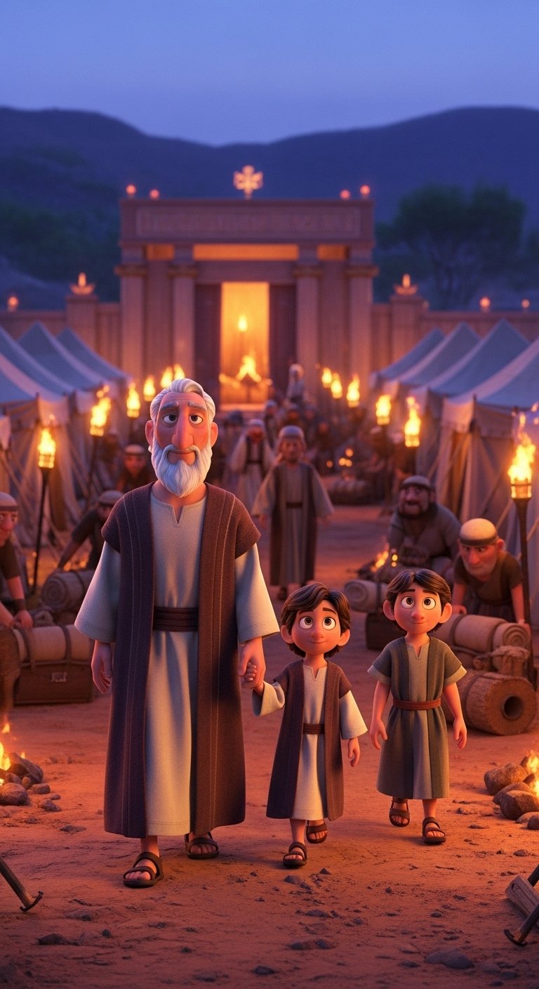 The desert sun began its gentle descent, painting the nomadic camp in warm hues. Aaron, wise and serene, felt the familiar stirring; it was time to move. His sons stood ready, understanding the weight of their sacred duty. The air hummed with calm anticipation, a quiet readiness for faithful obedience.