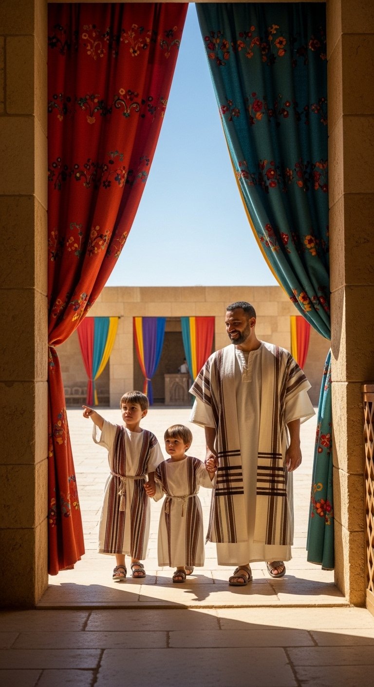 With hushed reverence, Aaron and his sons, Eleazar and Ithamar, approached the Tabernacle. Its colorful embroidered curtains billowed softly in the breeze, a vibrant beacon. They passed through the outer courtyard, their footsteps light and purposeful, hearts prepared for the solemn task within the holy space.