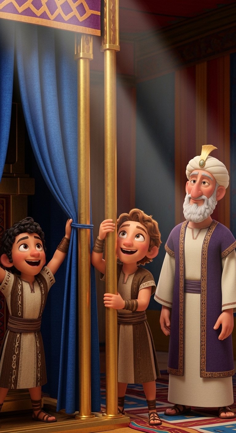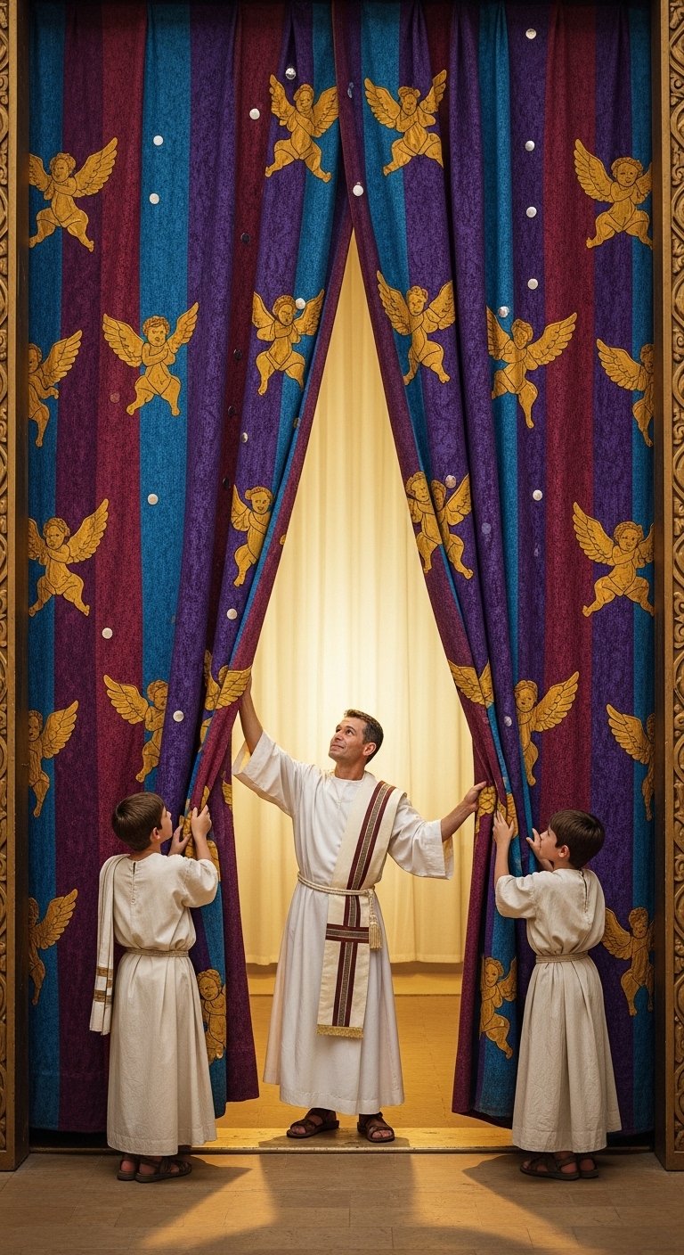 Inside, the air was still. Before them stood the magnificent inner curtain, a masterpiece of blue, purple, and scarlet threads, woven with cherubim. With practiced grace and utmost care, Aaron reached up, his sons assisting, as they began to unhook the heavy fabric. Each movement was deliberate, a silent prayer of respect.
