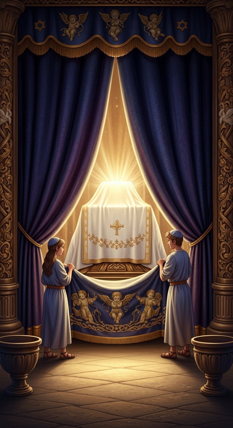 As the inner curtain gently came down, a soft, golden light seemed to emanate. There, partially veiled, rested the Ark of the Covenant. With solemn hands, they carefully draped the majestic curtain over the Ark, covering its sacred presence entirely. It was an act of profound protection and reverence, shielding the divine mystery.