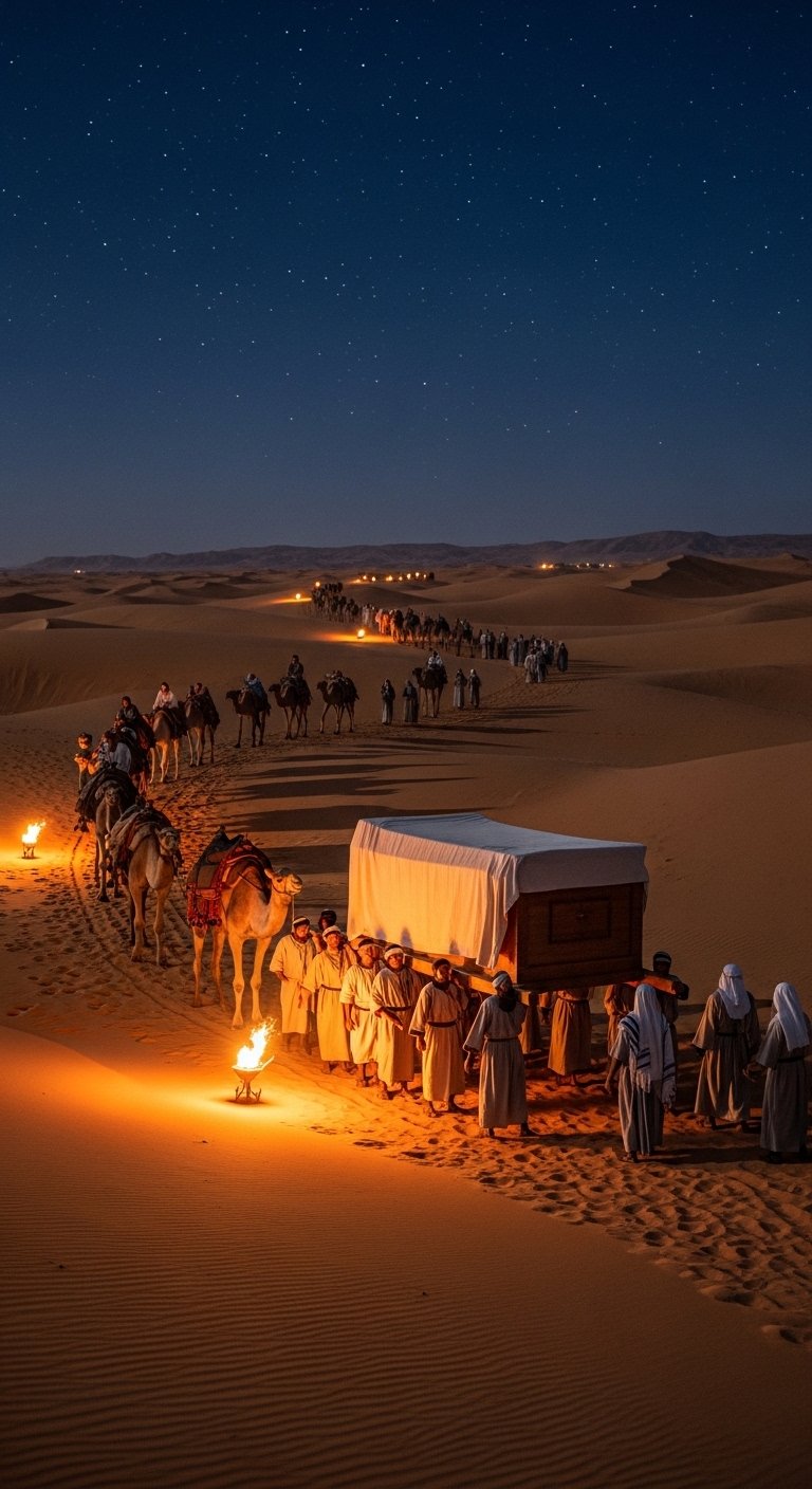 As the first camel trains, laden with tents, began to slowly pull away into the desert night, a gentle rhythm emerged. The camp was shifting, embarking on another leg of their journey. The covered Ark, carefully borne by the Levites, would soon follow, a silent, powerful presence guiding them, protected by its veil.Aaron and his sons' reverent obedience ensured the sacred Ark was safeguarded, enabling the community's journey of faith. Their careful hands and faithful hearts were instrumental in moving God's presence. "The Lord bless you and keep you; the Lord make his face shine on you and be gracious to you; the Lord turn his face toward you and give you peace." (Numbers 6:24-26)