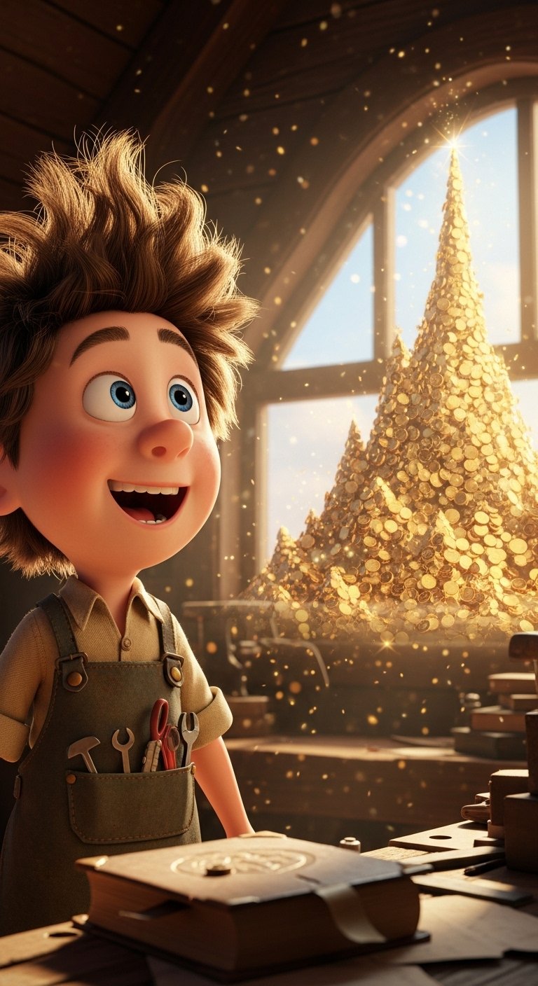 Pip, a young inventor with an unruly mop of hair, sat amidst a whimsical clutter in his sun-drenched attic. His eyes, however, weren't on his half-built flying machine, but gleamed with dreams of a towering mountain of shimmering gold coins, while a dusty, leather-bound book titled "Principles of Ingenuity" lay forgotten on a nearby shelf.