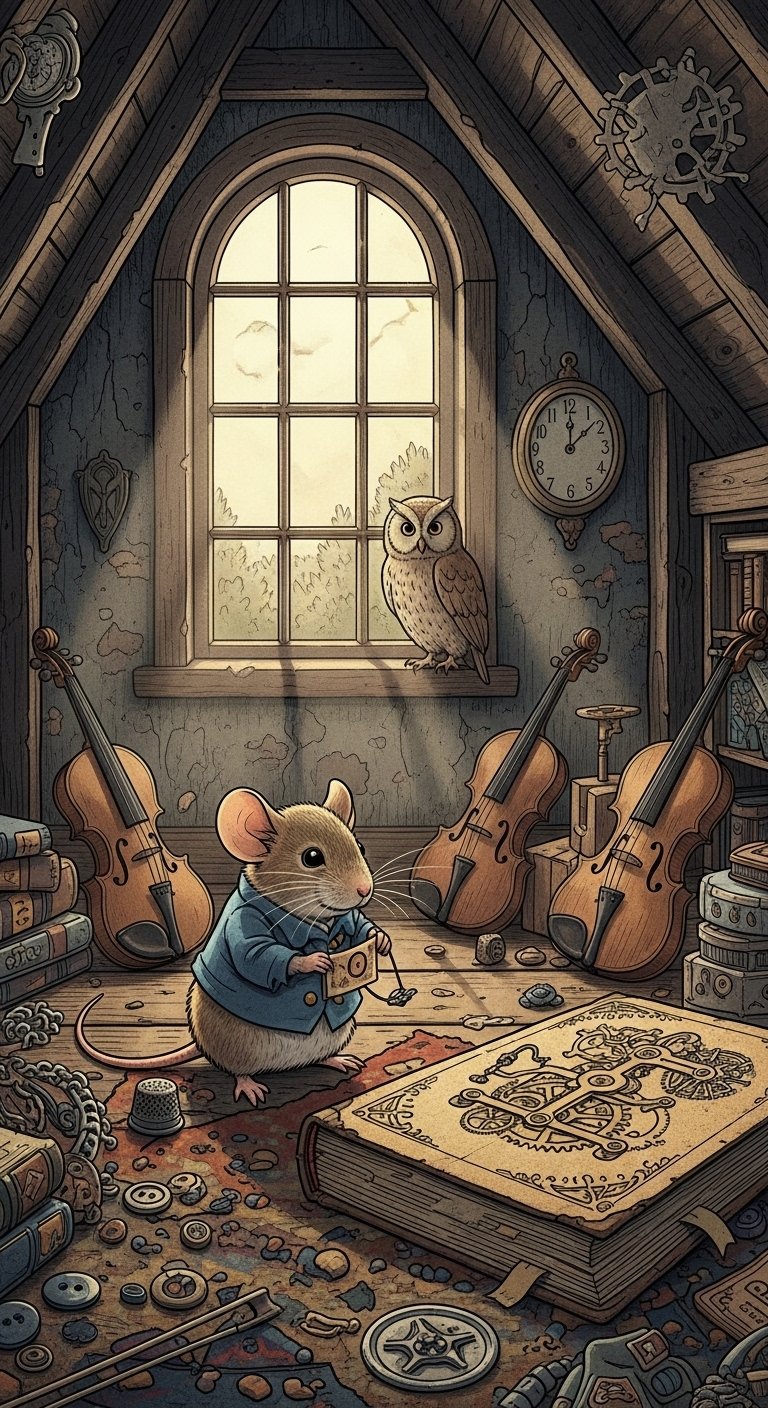 Days later, the once-forgotten attic was quieter, filled not with frantic, gold-driven efforts, but with the steady, thoughtful hum of a different kind of invention. Pip, now diligently studying the old book, carefully crafted a small, perfectly functioning clockwork cog, a piece of ingenuity born not of greed, but of growing wisdom. The wise owl, peeking through the window, offered a silent, approving blink.Pip finally understood that true wealth isn't in fleeting riches but in the lasting value of knowledge and skill, building something meaningful rather than chasing the superficial. He learned that diligence and genuine contribution lead to true fulfillment. For wisdom is more profitable than silver, and her wages are better than gold. (Proverbs 3:14)