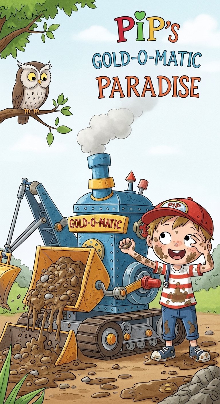 Determined to strike it rich quickly, Pip unveiled his "Gold-O-Matic Digger." With a triumphant flourish, he activated it, but the clunky machine merely sputtered, burrowing into earth only to unearth a shower of mud and pebbles, leaving Pip grimy and frustrated. A wise, old owl perched nearby observed with a knowing, unblinking gaze.